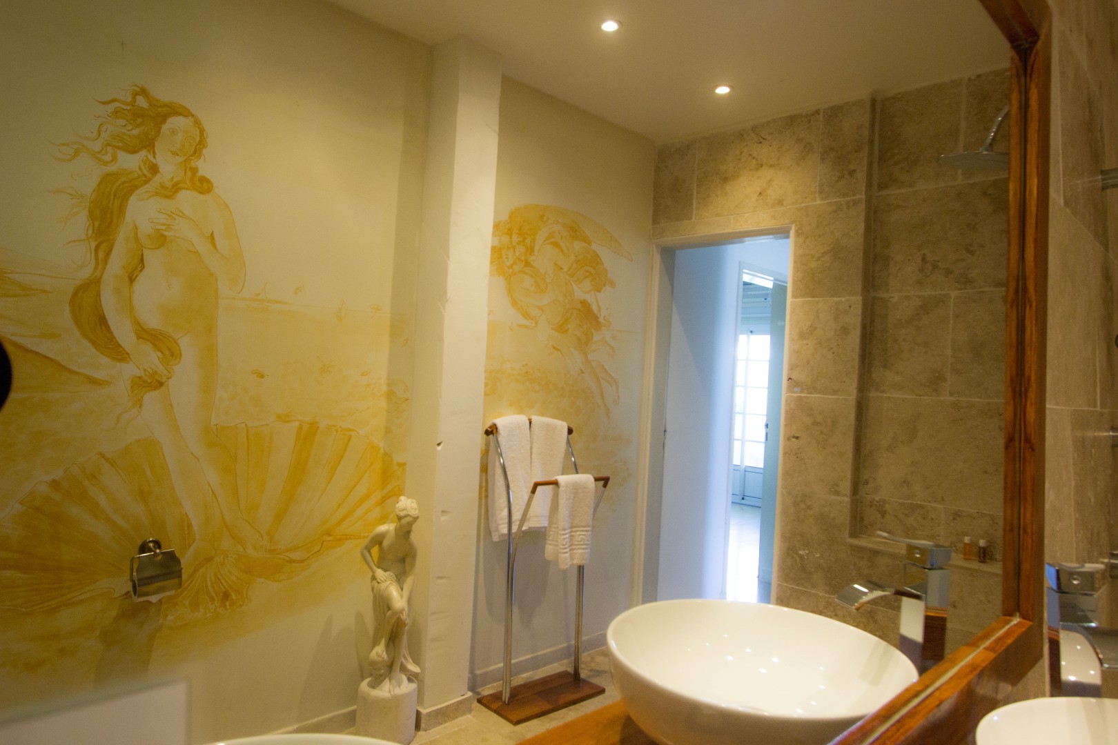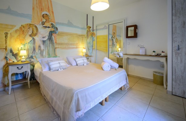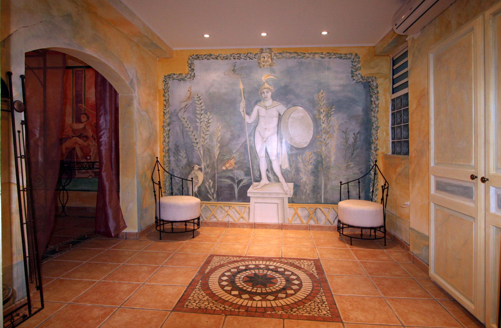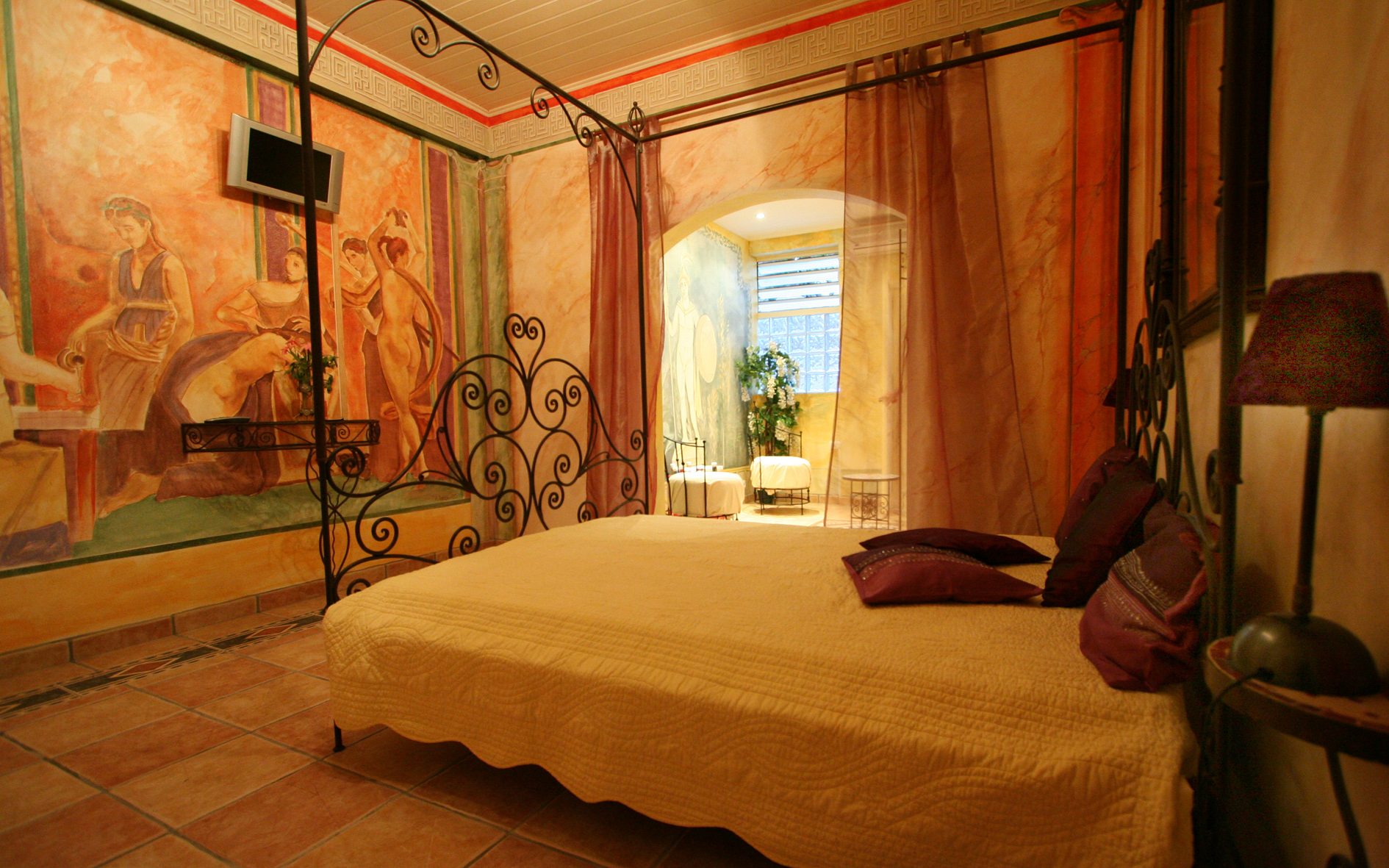 Suite nuptiale Pompéi . Plongez-vous dans un voyage au cœur des thermes de la Rome antique: suite de 50 m2 située en rez de jardin. Fresques murales dans toutes les pièces. Lit à baldaquin, marqueterie et bois précieux, grande salle de bain avec douche à l’italienne et baignoire balnéo. Mini bar, air conditionné, Tv par satellite, WIFI gratuit, plateau de courtoisie, produits d’accueil, peignoirs , sèche-cheveux, serviettes de piscine Capacité 2 personnes.